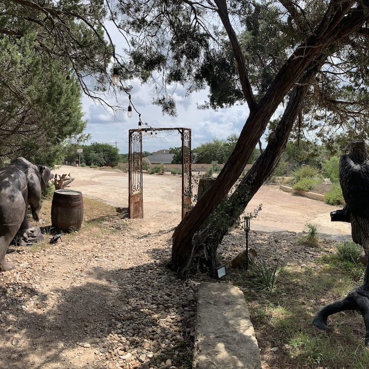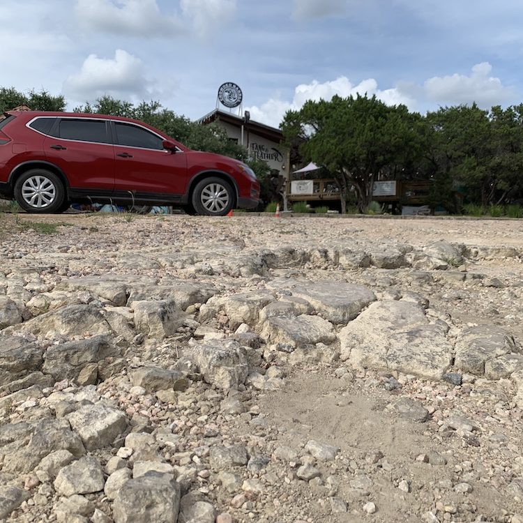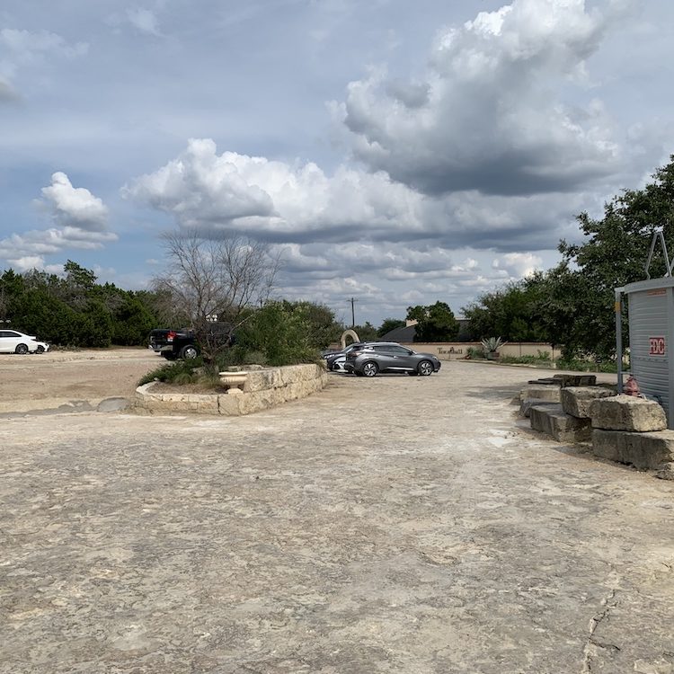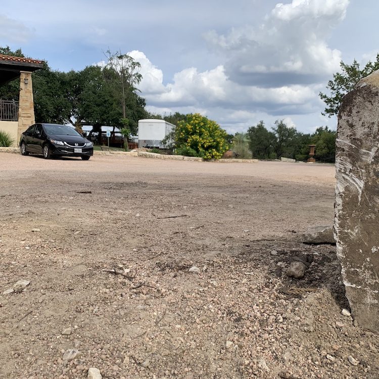 Cars would park in this meadow in the early days when there was nothing here but a free wedding chapel and a converted shed that provided modest refreshments to pilgrims who came to be married. The cars wore the soil down to bedrock. At some point the village elders started spreading gravel around to help with the mud. And that’s as far as organized development has advanced for Meadow Lane.