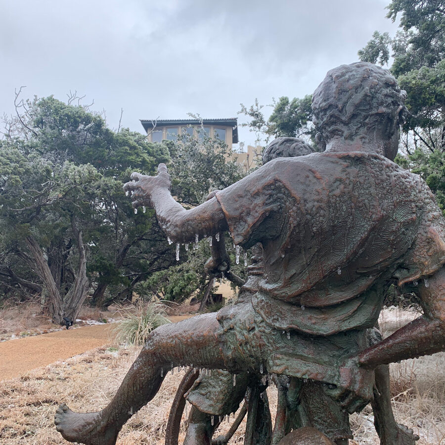 It was the day of the big freeze. Sheets of ice covered the campus, and parts of buildings usually hidden by trees were suddenly visible as branches dipped and sagged beneath the ice. Statues glittered. The two boys on a bicycle near the Tower had icicle earrings.